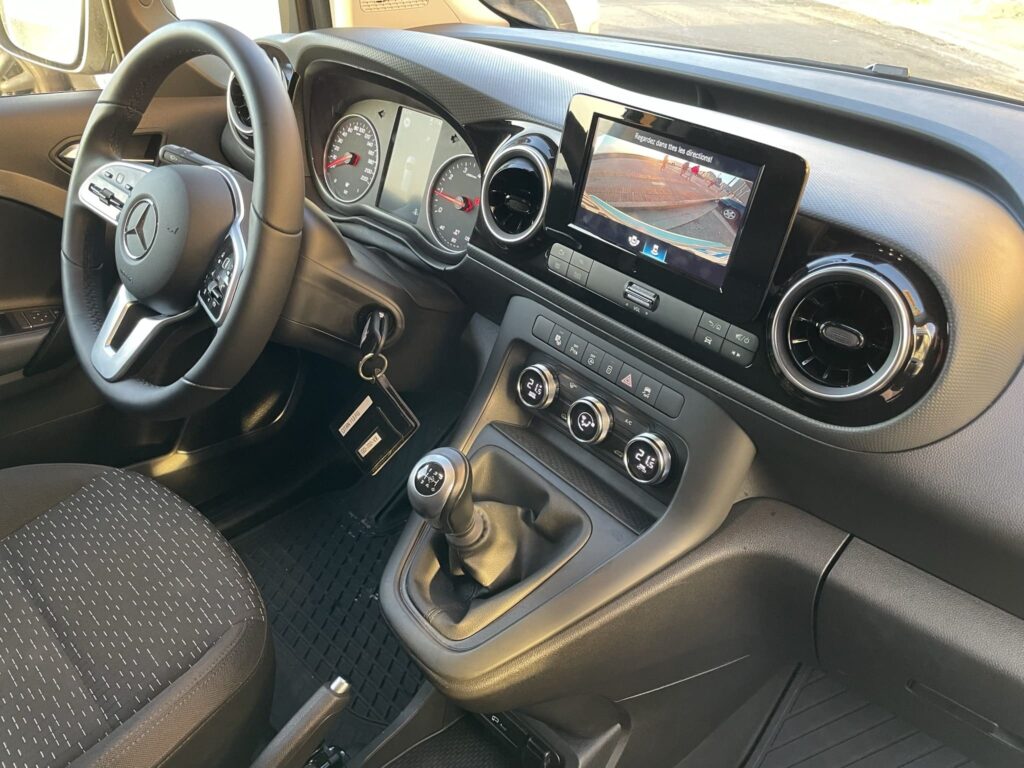 Dès le premier niveau de finition « FIRST » le client dispose de série du fameux MBUX de Mercedes qui redéfinit le multimédia pour une expérience utilisateur au meilleur niveau (avec navigation, radio numérique DAB, écran tactile 7 pouces, fonctions téléphone main-libre, Apple Carplay et Android auto), l’offre Mercedes Me Connect (gestion de la maintenance et services à distance à destination des pros), le volant multifonction, les capteurs de luminosité et de pluie automatiques, le rétroviseur conducteur chauffant et électrique, les feux de jour à LED avec une très belle signature lumineuse typique de la marque allemande, l’alerte conducteur en cas de fatigue, le régulateur de vitesse et pas moins de 6 airbags (frontaux, latéraux et thorax pour le conducteur et passager). Le confort et la sécurité passent avant tout chez Mercedes ! Alors nous sommes certes à bord d’un utilitaire mais avec une approche plus « premium » que son cousin français ou que d’autres concurrents du segment.